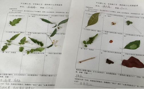 秋天不止在远方,更在我们走出户外的瞬间。大自然是人人都拥有的珍宝,也是治愈生活的一颗解药。11月21日在紧张的期中考结束后组织学生来到校园放松心情,鼓励他们用明亮的眼睛、机警的耳朵、灵敏的鼻子和嘴巴、聪明的大脑以及灵巧的双手来寻找到独属于自已的宝藏。在不违反规则和伤害他人的情况下能带回来就带回来,不能带回来的话请在格子里写一句话描述它或者画下来。